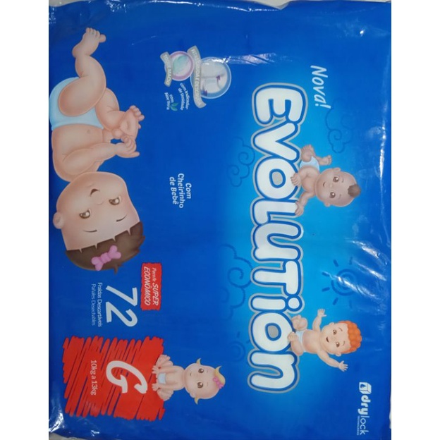 Fraldas Evolution pacotão com 72 fraldas descartável tamanho G para criança de 10 a 13 kg com indicado de Umidade com Aloe Vera.
